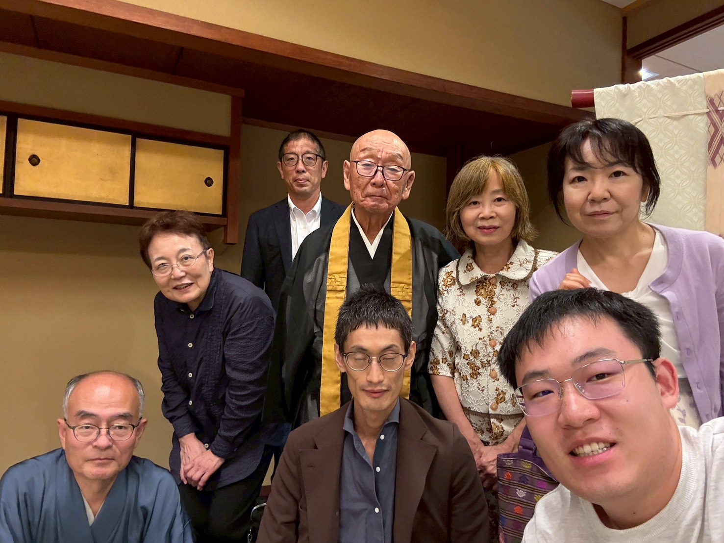 お茶席は、名古屋の松尾流(千手院) 、表千家よしの会(玉蔵院)、裏千家淡交会奈良支部(成福院)の三席。千手院は小堀遠州作の庭園で有名な塔頭です。田尾先輩から詳しい解説をいただきました。玉蔵院での表千家茶席では、昨年同様ご亭主、立派な茶器とともに記念撮影させていただきました。裏千家茶席は成福院。寺宝の趣きあるお茶碗を拝見。田尾先輩が次客で、お茶席が進みました。